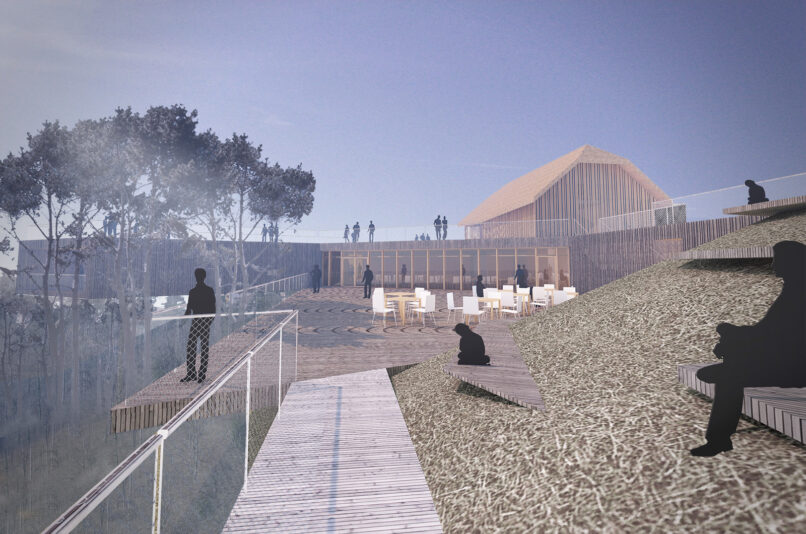 bistvene poglede na dolino. Podrejen podstavek obstoječi hiši Ekomuzeja se skuša zliti s terenom, hkrati pa gre za ambiciozno oblikovano arhitekturo, ki pritiče glavni vstopni točki Krajinskega parka Pivških presihajočih jezer kot središču za osveščanje obiskovalcev o naravnih vrednotah območja.