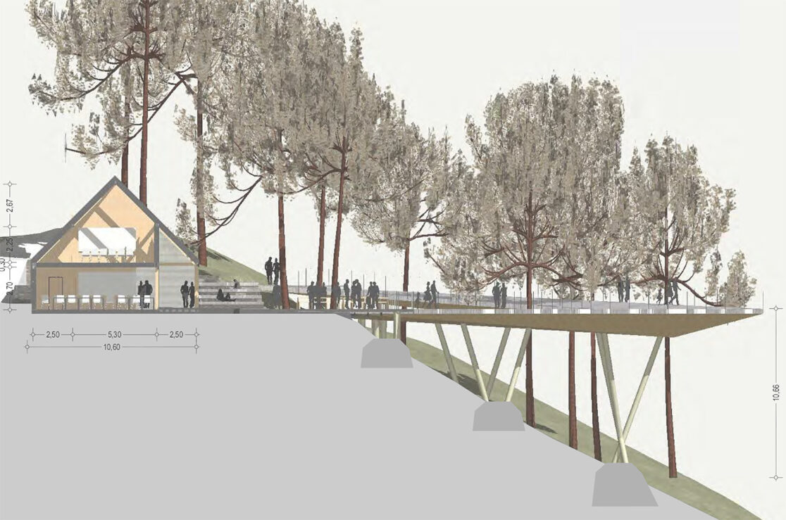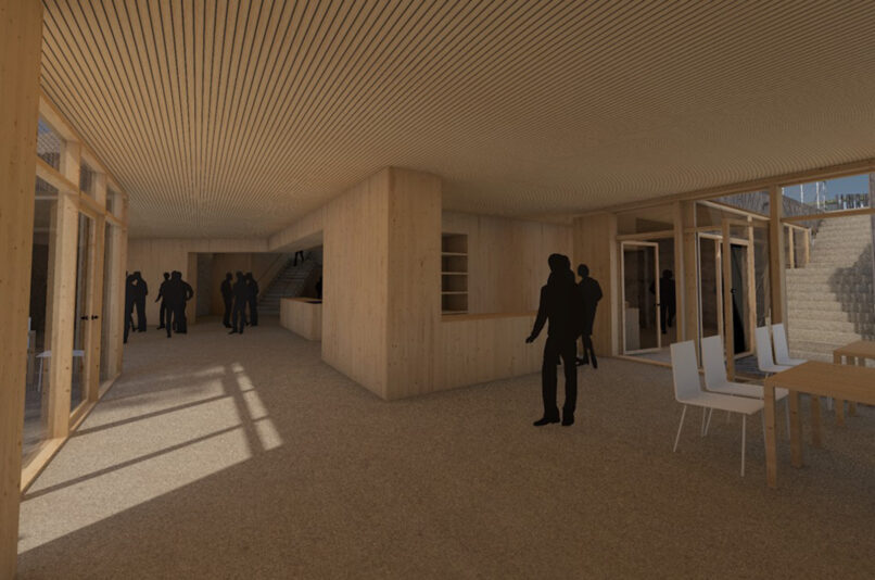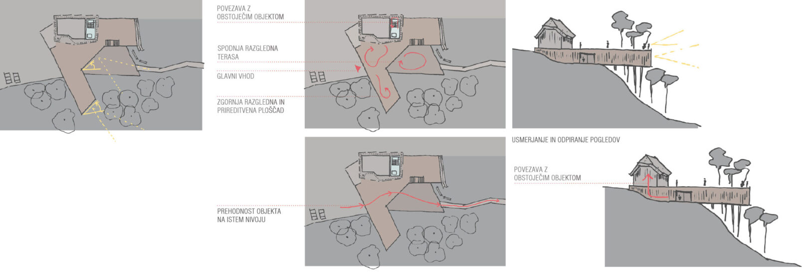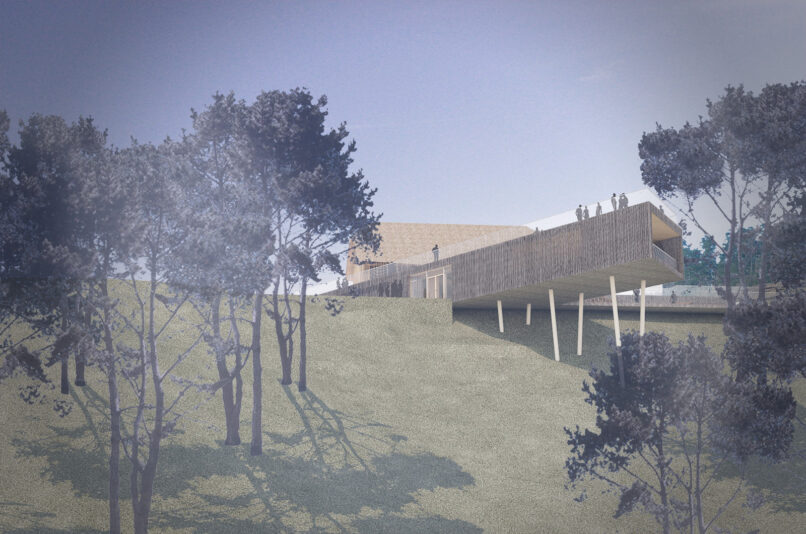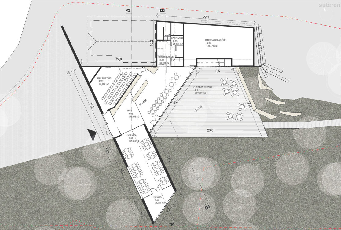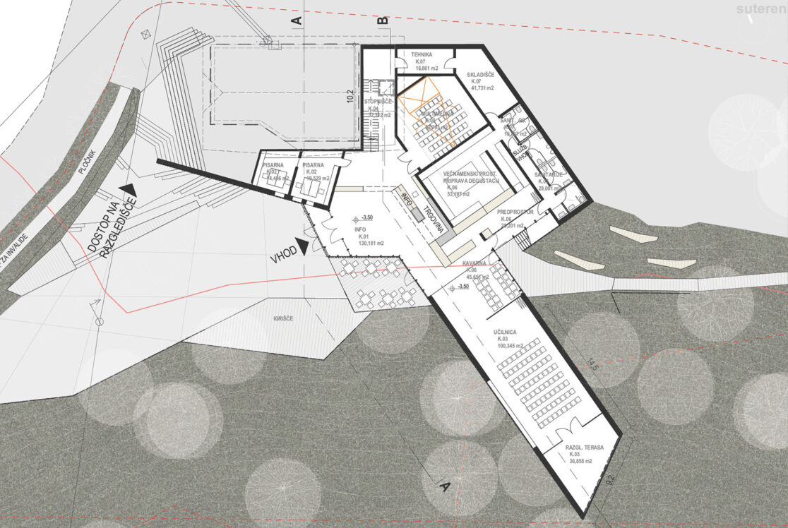 Z namenom čimboljše dostopnosti in povezljivosti novih programov v navezavi na javno površino je novi program tako umeščen v vkopan objekt, ki se nad brežino iztegne v kubus, ki zalebdi nad pokrajino in s svojo pozicijo usmerja