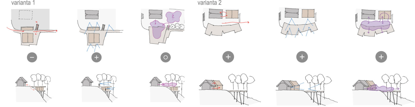 Variantno se obstoječi stavbi dodati vzporedni dodatni objekt, enostavno oblikovan s transparentno opno iz polikarbonata, kot nekakšen negativ ali ne-hiša, javni prostor pa se raztegne v krožno pot preko ambiciozne previsne konzolne razgledne ploščadi.