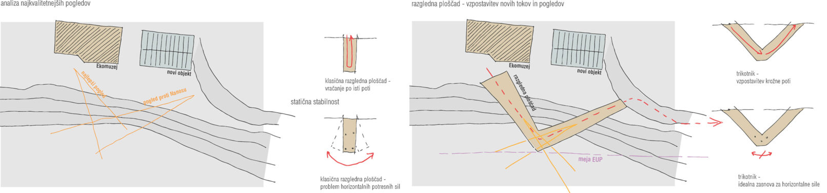 Variantne rešitve obravnavajo razširitev programov Ekomuzeja Pivških presihajočih jezer, ki danes domuje na robu ježe, nad dolino pivke, v “tipski” zgradbi – arhetipu pivške hiše z dvokapno streho s čopi, ne dosti drugačni od sosednjih stanovanjskih hiš. Pomemben vidik projekta je umestitev razgledne ploščadi nad dolino reke Pivke.