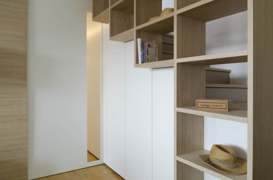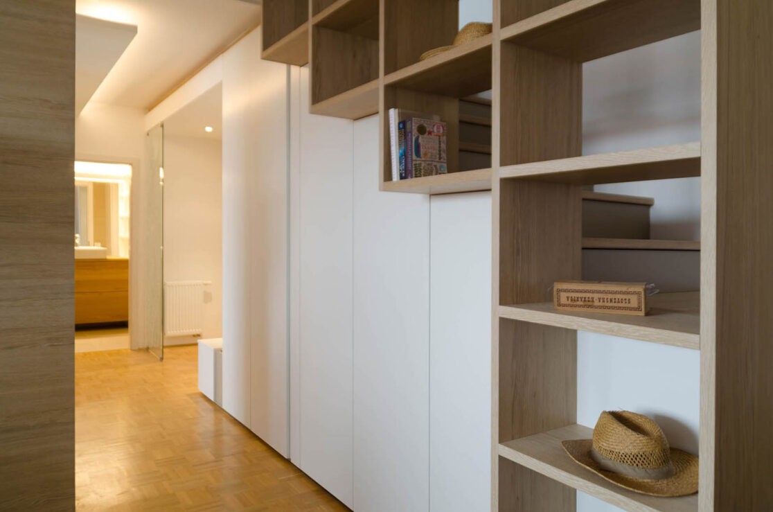 Dupleks stanovanje v mansardi večstanovanjske stavbe zgrajene za trg, smo prenovili in opremili bolj funkcionalno kot je to dopuščala siceršnja povprečna tlorisna zasnova stanovanja. Starejši par, ki tu občasno živi, si je zaželel več prostora z ashranjevanje in knjižnico, ter bolj funkcionalno kopalnico, kjer je bilo potrebno tudi skriti neposrečeno umeščeno ogrevalno napravo. Pri oblikovanju pregradnih elementov za ustvarjanje intime smo se naslonili na motiviko aboridžinske umetnosti Avstralije, od koder lastnika prihajata.